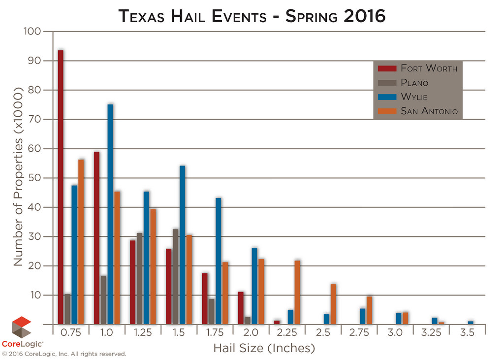 According to new data released by CoreLogic, the 2016 hail season is already one of the most severe in Texas history, with year-to-date results reaching the nine-year average for U.S. hail storm damage. Estimated losses in Fort Worth, Plano, Wylie and San Antonio totaled $689.6 million. Below is a summary highlight of the hail size, number and percentage of properties* affected by hail damage and the total estimated losses for these spring hail events.