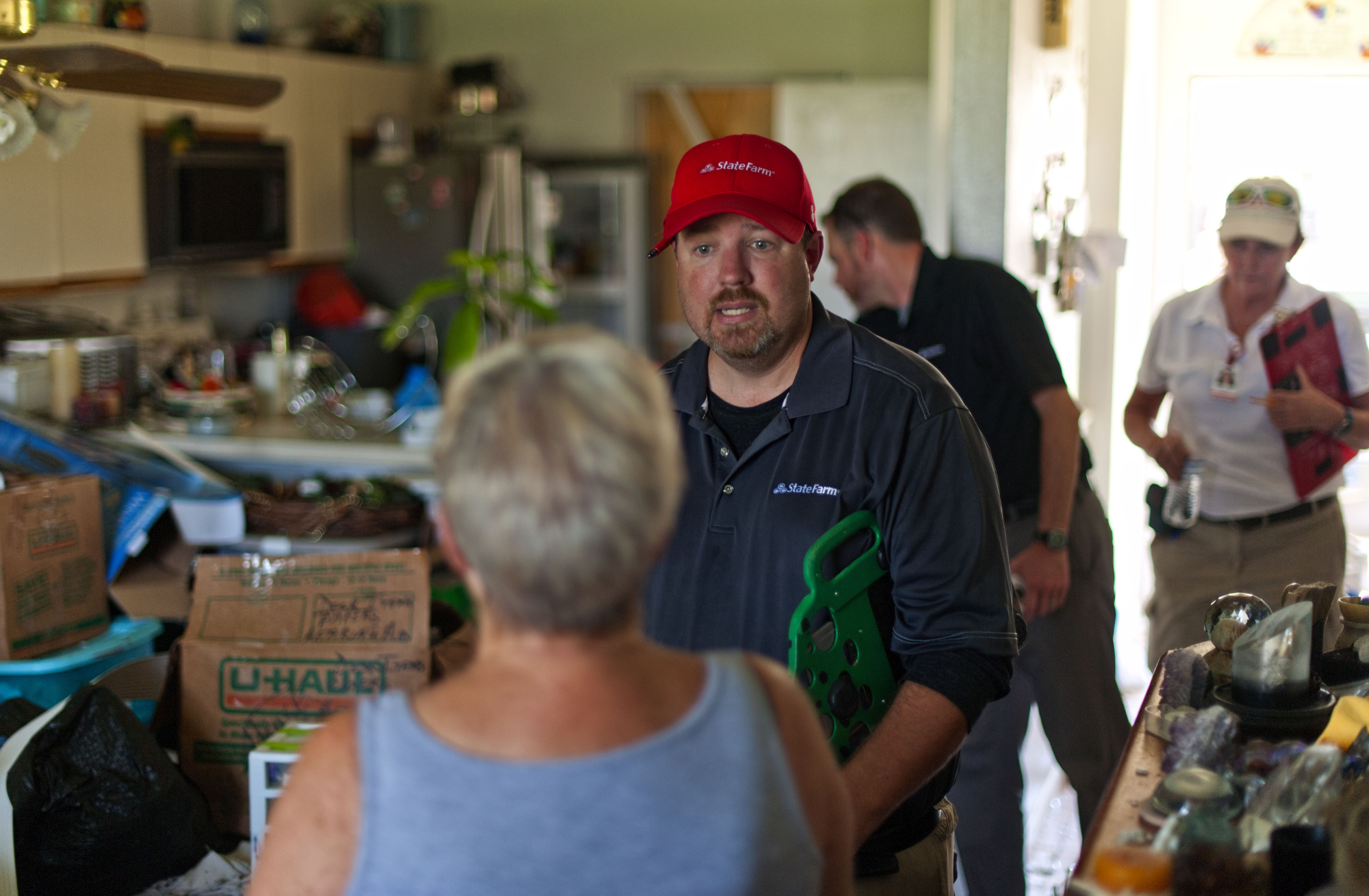 In 1999, his first job at State Farm was dealing with property lost in house fires. When Hurricane Katrina struck in 2005, he was deployed for the first time as a catastrophe claims adjuster. Since then he’s been sent to dozens of disasters. At home, where he left his wife and their 3-week-old baby, he keeps a bag packed since he’s often deployed with less than a day’s notice.
