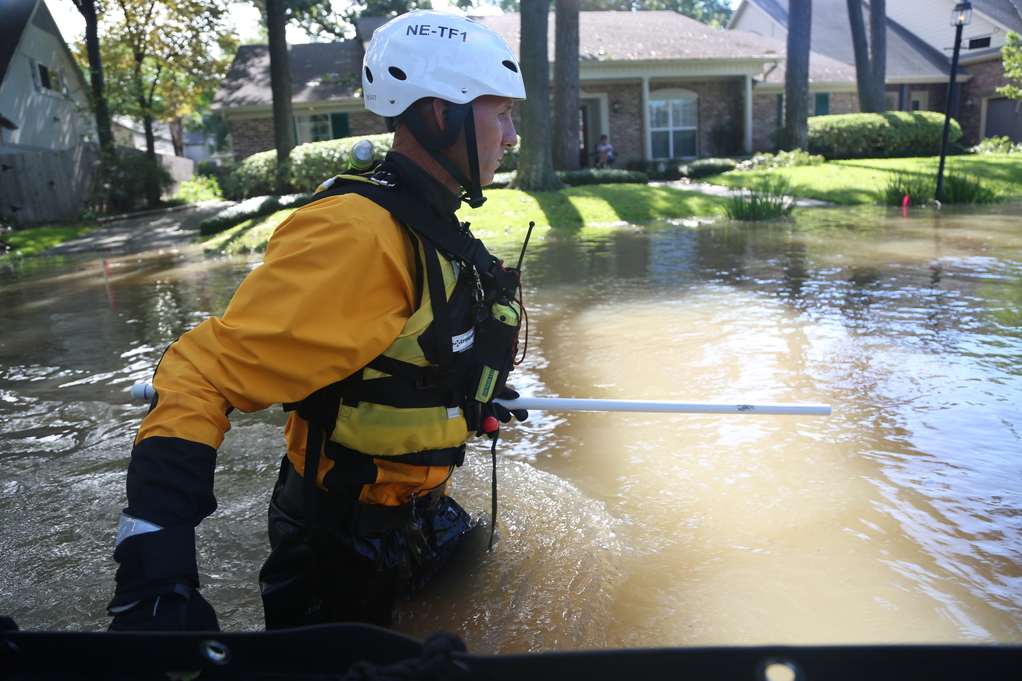 Member of FEMA’s Urban Search and Rescue Nebraska Task Force One (NE-TF1) wades through waist high water removing survivors from a neighborhood impacted by flooding from Hurricane Harvey