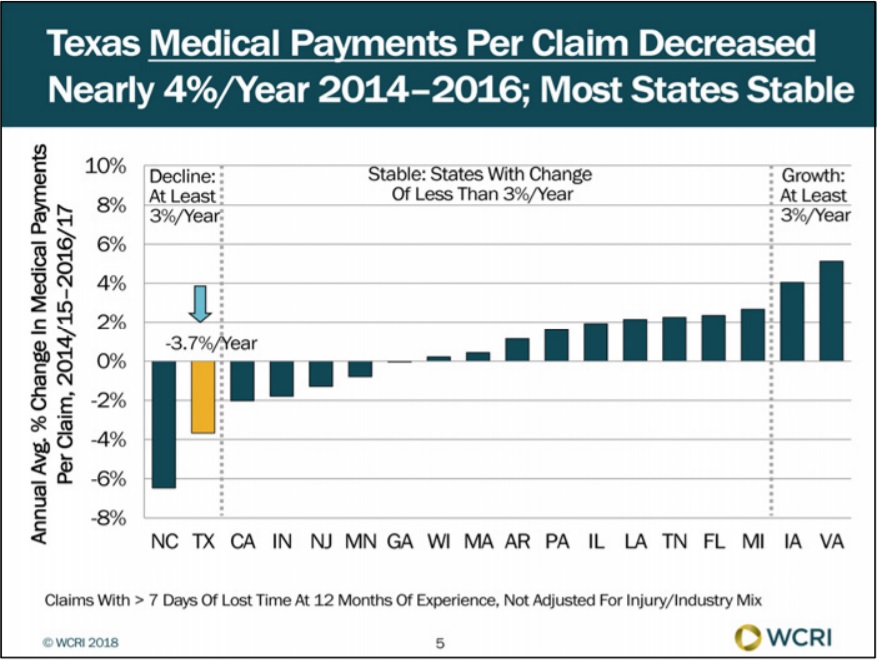 - Medical payments per claim decreased nearly 4 percent per year in Texas from 2014 to 2016 for claims at 12 months of experience, but they were fairly stable in most study states.