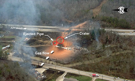 No one was seriously injured when the pipeline ruptured on Dec. 11, 2012, and the gas ignited and exploded about 100 feet west of I-77 in Sissonville. The rupture released more than 76 million standard cubic feet of natural gas, which burned. Fire damage extended nearly 1,100 feet along the pipeline right of way and the blast hurled a 20-foot section of pipe more than 40 feet.