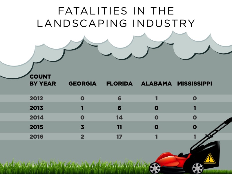Fatalities among workers in the landscaping industry are a growing concern in the Southeast. From 2012 to 2016, 64 people employed in the industry in Alabama, Florida, Georgia and Mississippi died as a result of workplace injuries. In Florida, industry fatalities have nearly tripled since 2012.