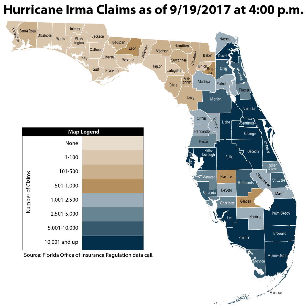 As of Tuesday, September 19, the Florida Office of Insurance Regulation reported more than 390,000 residential property claims and nearly 15,000 commercial property claims had been filed. Including all types of losses, total estimated insured losses thus far is nearing the $3 billion mark.