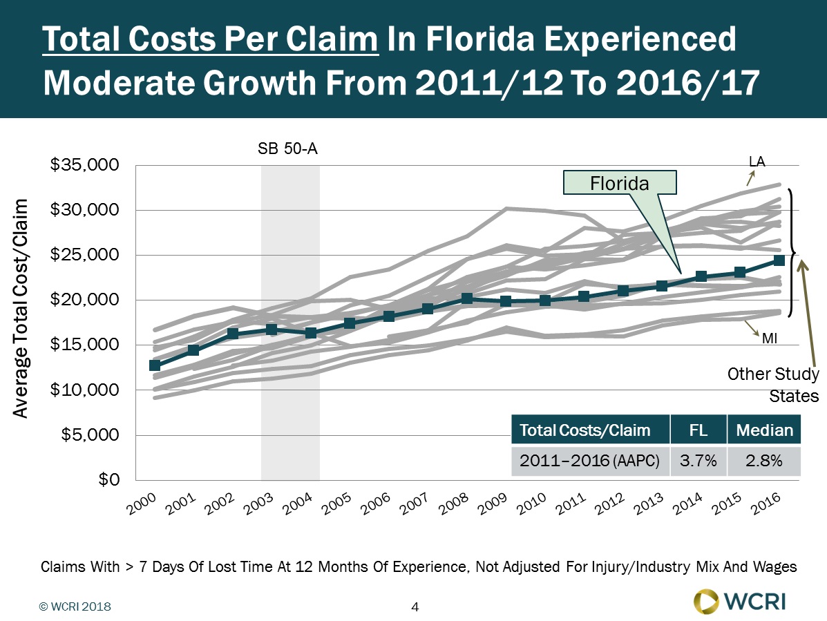 “Medical payments per claim, indemnity benefits per claim, and benefit delivery expenses per claim in Florida all grew moderately at 3 to 5 percent per year during this period,” said Ramona Tanabe, WCRI’s executive vice president and counsel.