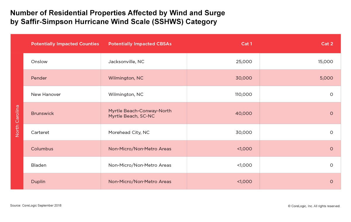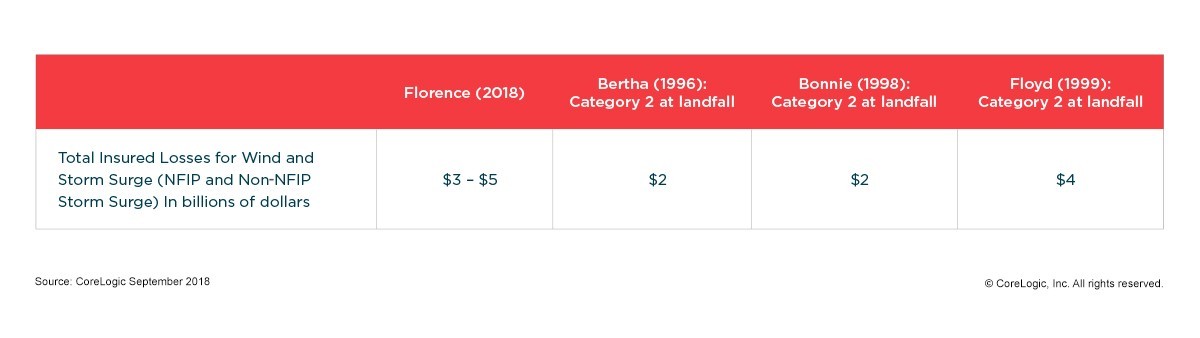 Torrential wind and storm surge from Hurricane Florence could cause between $3 – $5 billion in insured residential and commercial property losses, according to CoreLogic, a global property information, analytics and data-enabled solutions provider.