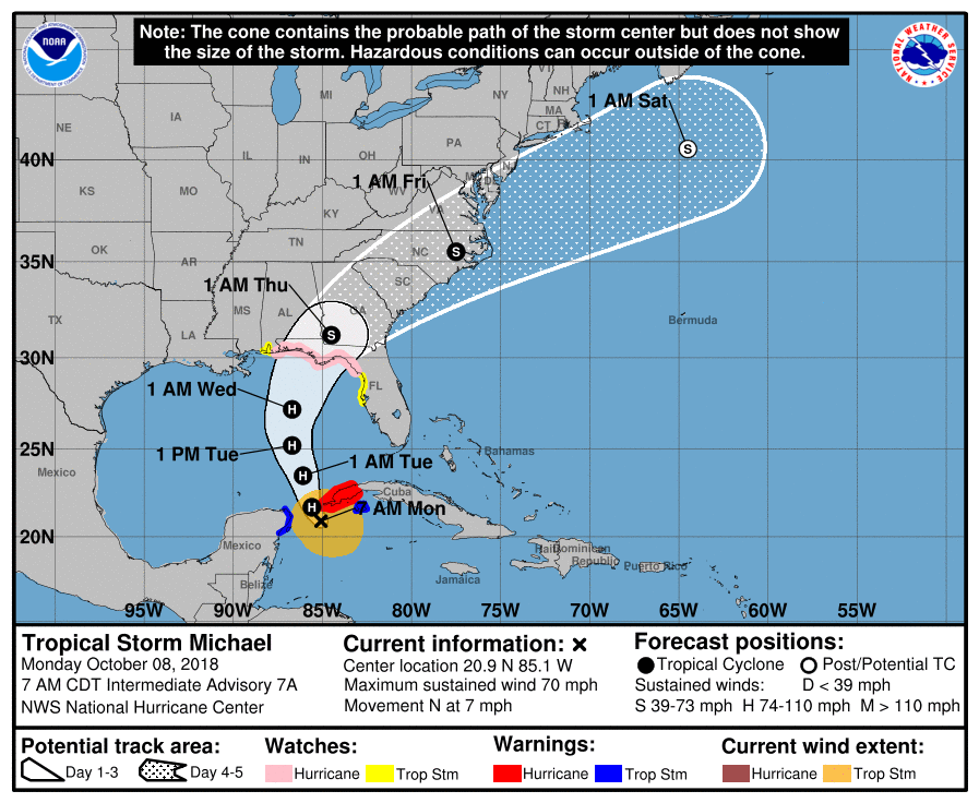 On the current forecast track, the center of Michael will move over the Yucatan Channel on Monday, then across the eastern Gulf of Mexico late Monday through Wednesday, according to the National Hurricane Center.