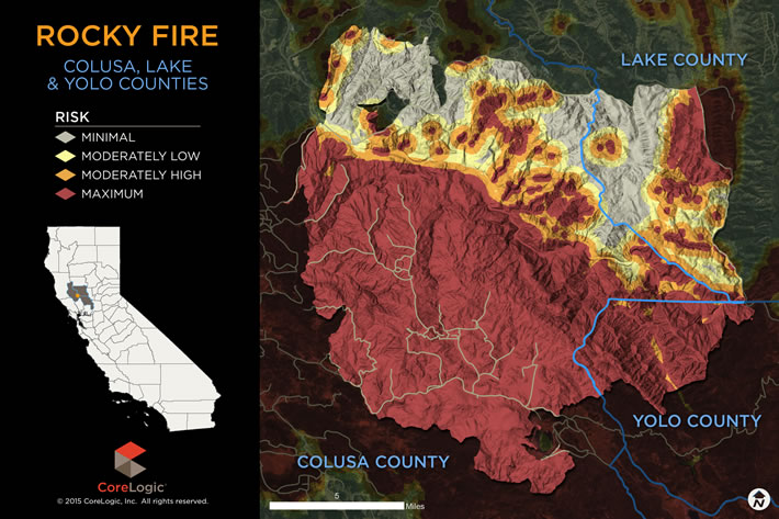 According to CoreLogic hazard risk analysis, a total of 927 homes, or 23 percent, with a total reconstruction cost of more than $221 million are at “Maximum Risk” or “Moderately High Risk” from the Rocky Wildfire occurring in the following Northern California zip codes: